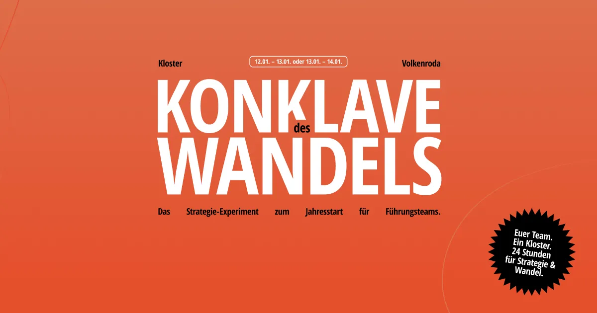 Das Konklave des Wandels. 24 Stunden schließen wir uns ein. Tauschen uns aus. Fokus in eurem Team. Dosierter Austausch mit anderen Teams. Maximale Inspiration. Volle Wandlungskraft. Neu ins neue Jahr starten. Ihr reist ab mit einer klaren Strategie & einem Plan. Wer will, präsentiert den Wandel & die Früchte auf der TALER & TALAR Konferenz 2026.